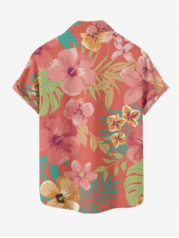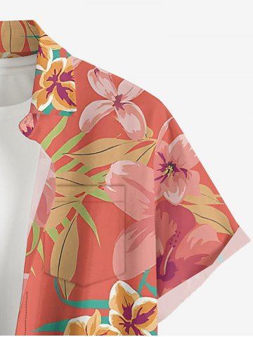 Plus Size Hibiscus Flower Tropical Leaf Print Buttons Pocket Hawaii Shirt For Men - Coral Pink - 5xl