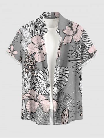 Plus Size Hibiscus Flower Tropical Leaf Print Buttons Pocket Hawaii Shirt For Men - Dark Gray - M