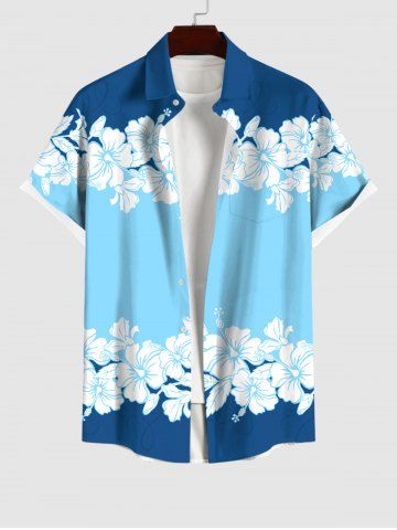 Plus Size Hibiscus Flowers Colorblock Print Buttons Pocket Hawaii Shirt For Men - Blue - Xl