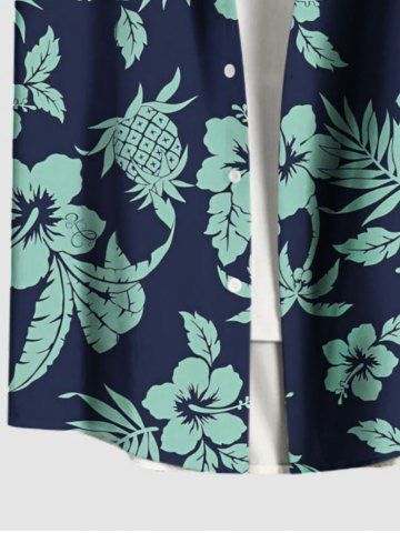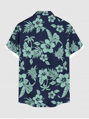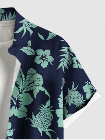 Plus Size Hibiscus Flowers Leaf Coconut Tree Pineapple Print Buttons Pocket Hawaii Shirt For Men - Navy Blue - L