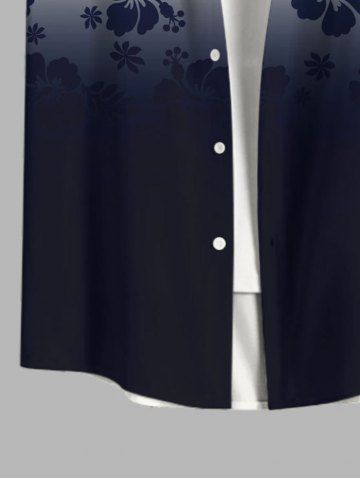 Plus Size Hibiscus Flowers Leaf Ombre Colorblock Print Buttons Pocket Hawaii Shirt For Men - Midnight Blue - L