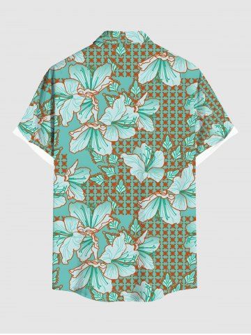 Plus Size Hibiscus Flowers Leaf Print Buttons Pocket Hawaii Shirt For Men - Green - L