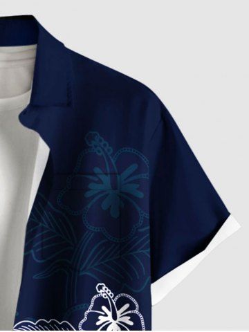 Plus Size Hibiscus Flowers Leaf Print Buttons Pocket Hawaii Shirt For Men - Navy Blue - 2xl