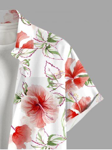 Plus Size Hibiscus Flowers Leaf Print Buttons Pocket Hawaii Shirt For Men - White - Xl