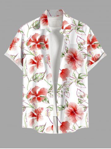 Plus Size Hibiscus Flowers Leaf Print Buttons Pocket Hawaii Shirt For Men - White - 3xl