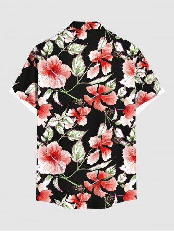 Plus Size Hibiscus Flowers Leaf Print Buttons Pocket Hawaii Shirt For Men - Black - M