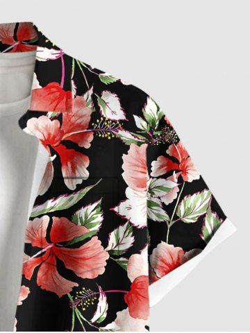 Plus Size Hibiscus Flowers Leaf Print Buttons Pocket Hawaii Shirt For Men - Black - 2xl