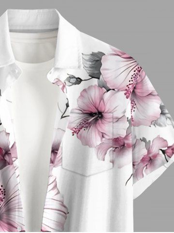 Plus Size Hibiscus Flowers Leaf Print Buttons Pocket Hawaii Shirt For Men - White - L