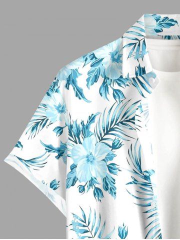 Plus Size Hibiscus Flowers Leaf Print Buttons Pocket Hawaii Shirt For Men - Light Blue - Xl