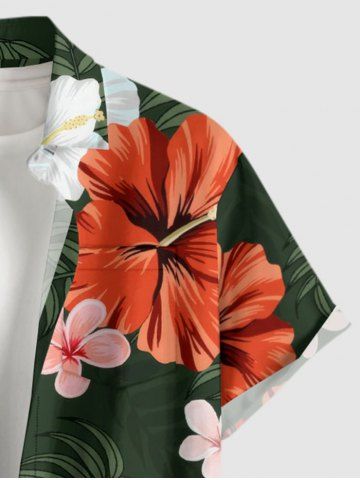 Plus Size Hibiscus Flowers Leaf Print Buttons Pocket Hawaii Shirt For Men - Deep Green - S
