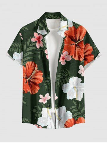 Plus Size Hibiscus Flowers Leaf Print Buttons Pocket Hawaii Shirt For Men - Deep Green - Xl