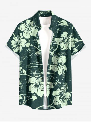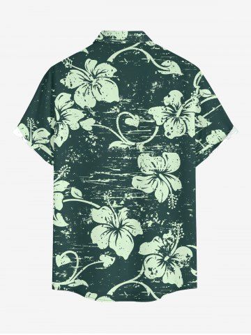 Plus Size Hibiscus Flowers Leaf Print Buttons Pocket Hawaii Shirt For Men - Deep Green - S