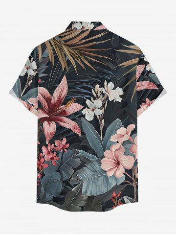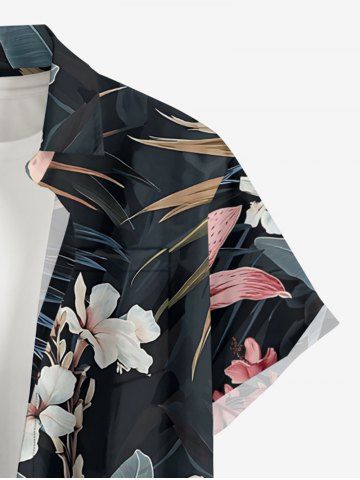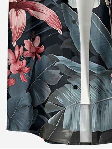 Plus Size Hibiscus Flowers Leaf Print Buttons Pocket Hawaii Shirt For Men - Black - L
