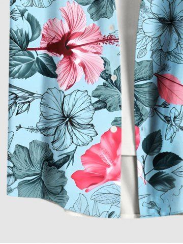 Plus Size Hibiscus Flowers Leaf Print Buttons Pocket Hawaii Shirt For Men - Sky Blue - 3xl