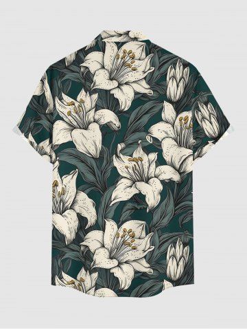 Plus Size Hibiscus Flowers Leaf Print Buttons Pocket Hawaii Shirt For Men - Deep Green - M