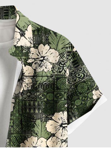 Plus Size Hibiscus Flowers Leaf Scarf Print Buttons Pocket Hawaii Shirt For Men - Green - 5xl