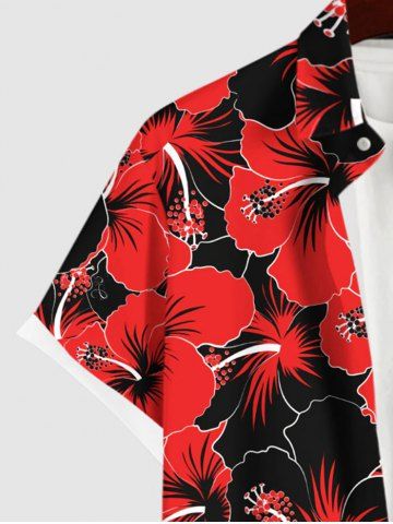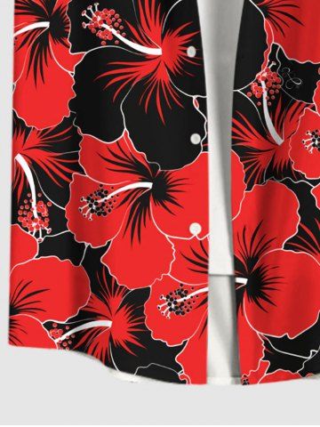 Plus Size Hibiscus Flowers Print Buttons Pocket Hawaii Shirt For Men - Red - Xl