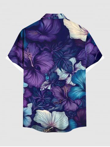 Plus Size Hibiscus Flowers Print Buttons Pocket Hawaii Shirt For Men - Purple - Xl