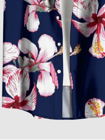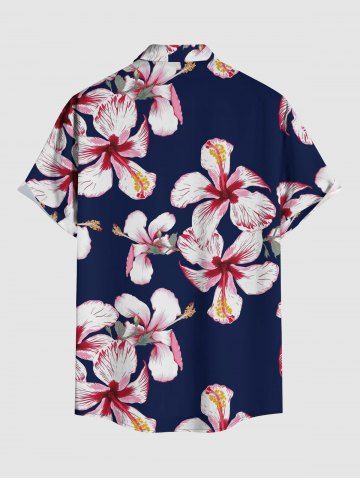 Plus Size Hibiscus Flowers Print Buttons Pocket Hawaii Shirt For Men - Midnight Blue - S