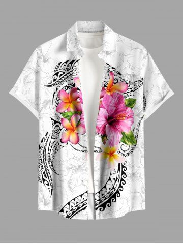 Plus Size Hibiscus Flowers Print Buttons Pocket Hawaii Shirt For Men - White - M