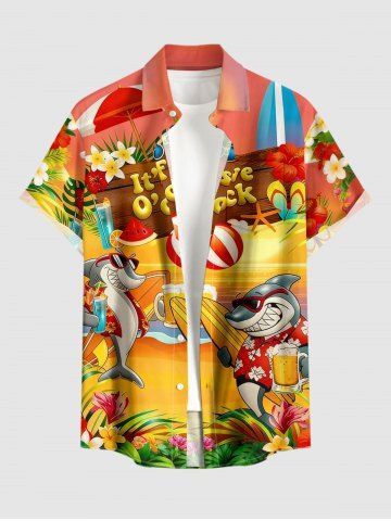 Plus Size Hibiscus Flowers Sharks Fruit Juice Watermelon Print Buttons Pocket Hawaii Shirt For Men - Orange - M