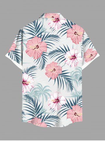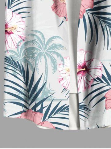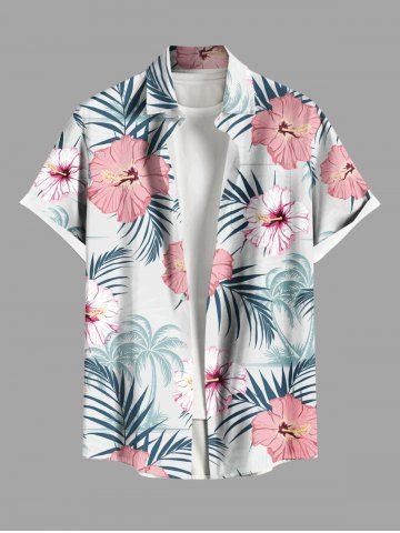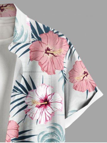 Plus Size Hibiscus Flowers Tropical Leaf Print Buttons Pocket Hawaii Shirt For Men - White - L