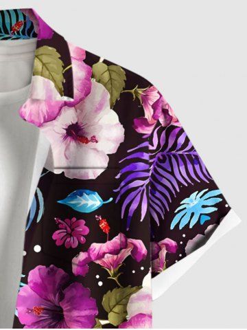 Plus Size Hibiscus Flowers Tropical Leaf Print Buttons Pocket Hawaii Shirt For Men - Purple - L