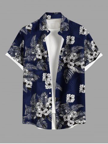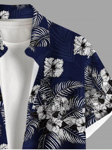 Plus Size Hibiscus Flowers Tropical Leaf Print Buttons Pocket Hawaii Shirt For Men - Navy Blue - L