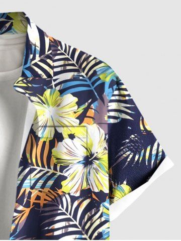 Plus Size Hibiscus Flowers Tropical Leaf Print Buttons Pocket Hawaii Shirt For Men - Navy Blue - Xl