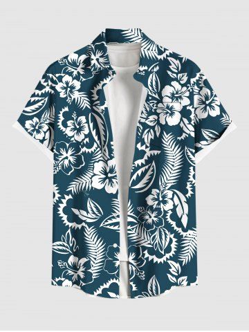 Plus Size Hibiscus Flowers Tropical Leaf Print Buttons Pocket Hawaii Shirt For Men - Peacock Blue - Xl