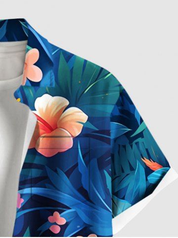 Plus Size Hibiscus Flowers Tropical Leaf Print Buttons Pocket Hawaii Shirt For Men - Sky Blue - S