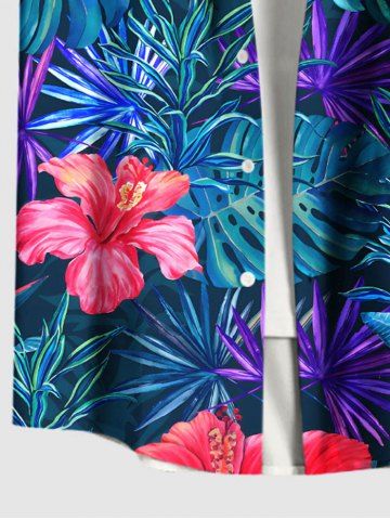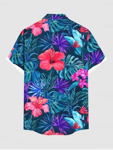 Plus Size Hibiscus Flowers Tropical Leaf Print Buttons Pocket Hawaii Shirt For Men - Navy Blue - L