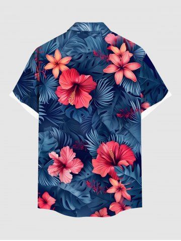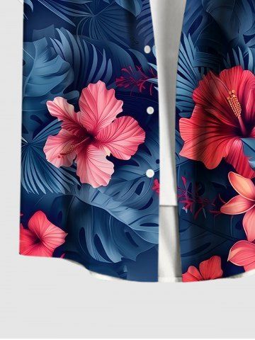 Plus Size Hibiscus Flowers Tropical Leaf Print Buttons Pocket Hawaii Shirt For Men - Navy Blue - 6xl