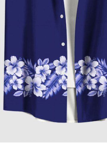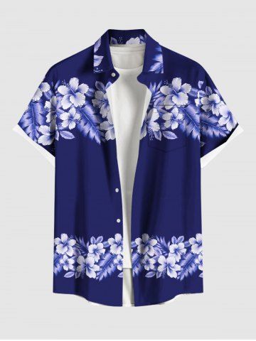 Plus Size Hibiscus Flowers Tropical Leaf Print Buttons Pocket Hawaii Shirt For Men - Blue - 3xl