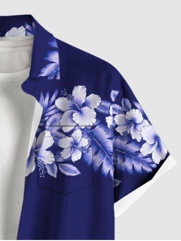 Plus Size Hibiscus Flowers Tropical Leaf Print Buttons Pocket Hawaii Shirt For Men - Blue - 4xl