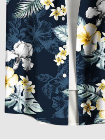 Plus Size Hibiscus Flowers Tropical Leaf Print Buttons Pocket Hawaii Shirt For Men - Midnight Blue - S