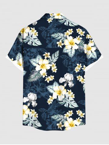Plus Size Hibiscus Flowers Tropical Leaf Print Buttons Pocket Hawaii Shirt For Men - Midnight Blue - 2xl