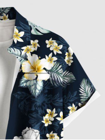 Plus Size Hibiscus Flowers Tropical Leaf Print Buttons Pocket Hawaii Shirt For Men - Midnight Blue - 3xl