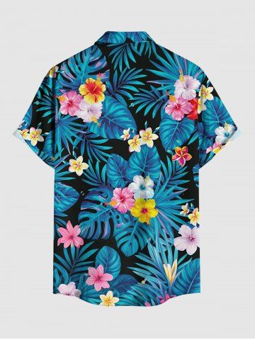 Plus Size Hibiscus Flowers Tropical Leaf Print Buttons Pocket Hawaii Shirt For Men - Blue - S