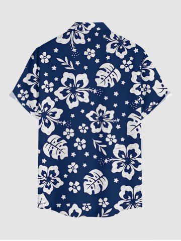 Plus Size Hibiscus Flowers Tropical Leaf Print Buttons Pocket Hawaii Shirt For Men - Deep Blue - M
