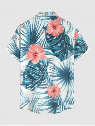 Plus Size Hibiscus Flowers Tropical Leaf Print Buttons Pocket Hawaii Shirt For Men - Peacock Blue - Xl