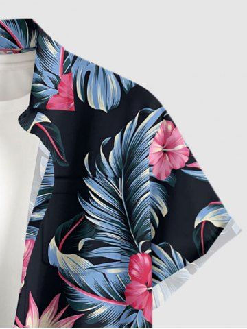 Plus Size Hibiscus Flowers Tropical Leaf Print Buttons Pocket Hawaii Shirt For Men - Black - L