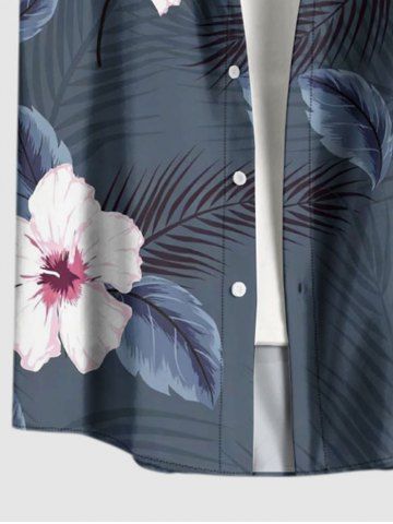 Plus Size Hibiscus Flowers Tropical Leaf Print Buttons Pocket Hawaii Shirt For Men - Blue Gray - 3xl