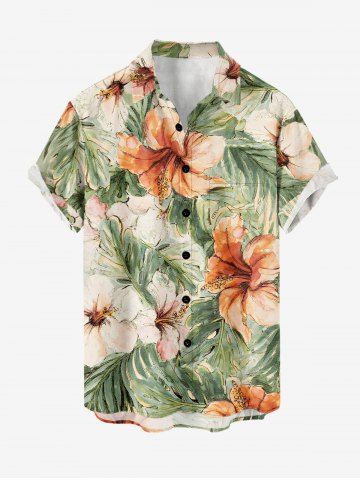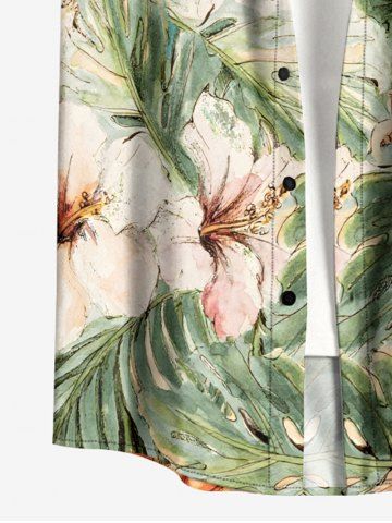 Plus Size Hibiscus Flowers Tropical Leaf Print Buttons Pocket Hawaii Shirt For Men - Green - L