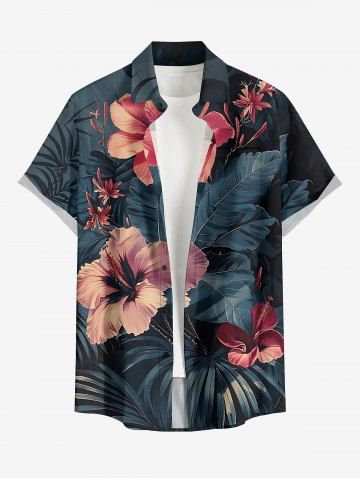 Plus Size Hibiscus Flowers Tropical Leaf Print Buttons Pocket Hawaii Shirt For Men - Black - M