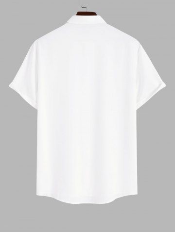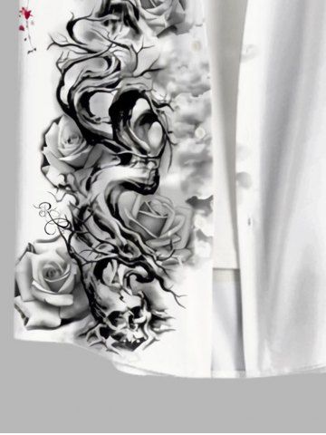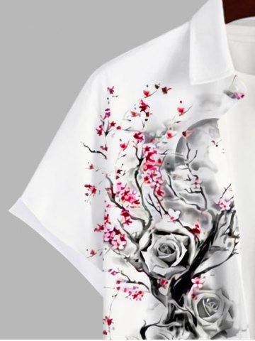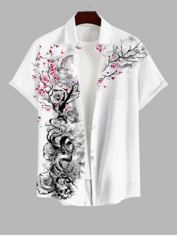 Plus Size Ink Painting Rose Flower Tree Branch Print Button Pocket Shirt For Men - White - Xl