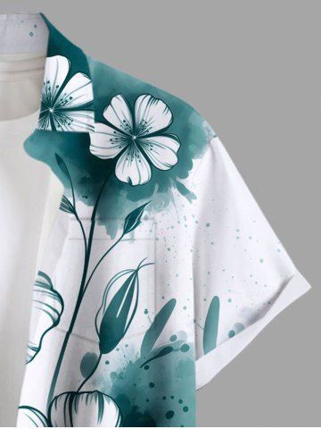 Plus Size Ink Painting Splatter Flower Branch Print Hawaii Button Pocket Shirt For Men - Green - 5xl