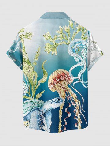 Plus Size Jellyfish Octopus Turtle Ombre Print Buttons Pocket Hawaii Shirt For Men - Sky Blue - 3xl