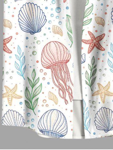 Plus Size Jellyfish Shell Starfish Leaf Print Buttons Pocket Hawaii Shirt For Men - White - S