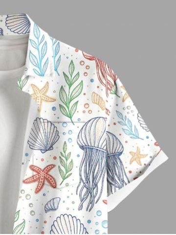 Plus Size Jellyfish Shell Starfish Leaf Print Buttons Pocket Hawaii Shirt For Men - White - 2xl